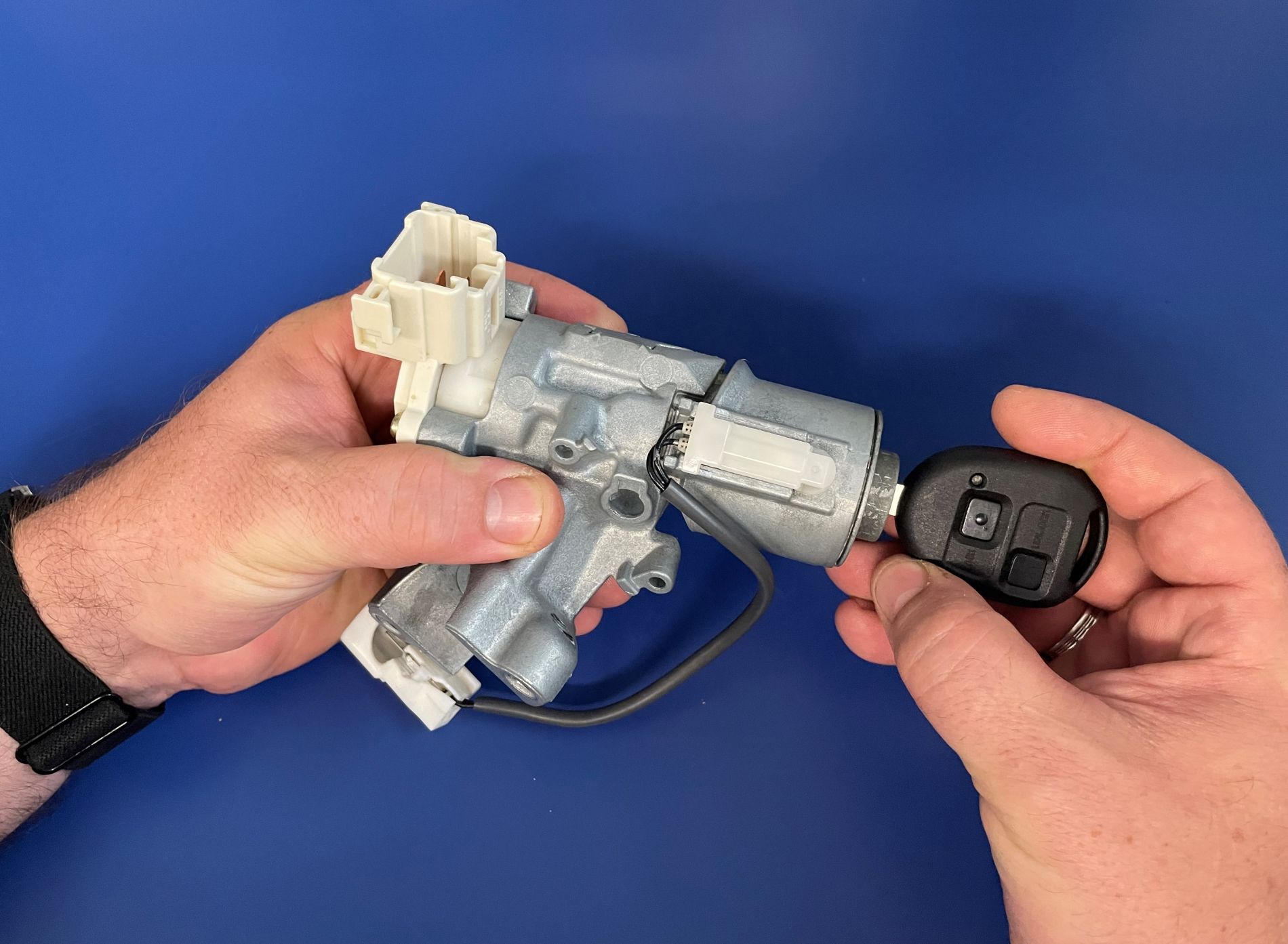 Po rozebraniu stacyjki okazało się, że zapadki wkładu są mocno zużyte i zablokowały mechanizm, co uniemożliwiało normalne przekręcenie kluczyka. To typowa usterka w autach intensywnie eksploatowanych — zużycie mechaniczne powoduje luz i w końcu zablokowanie działania.