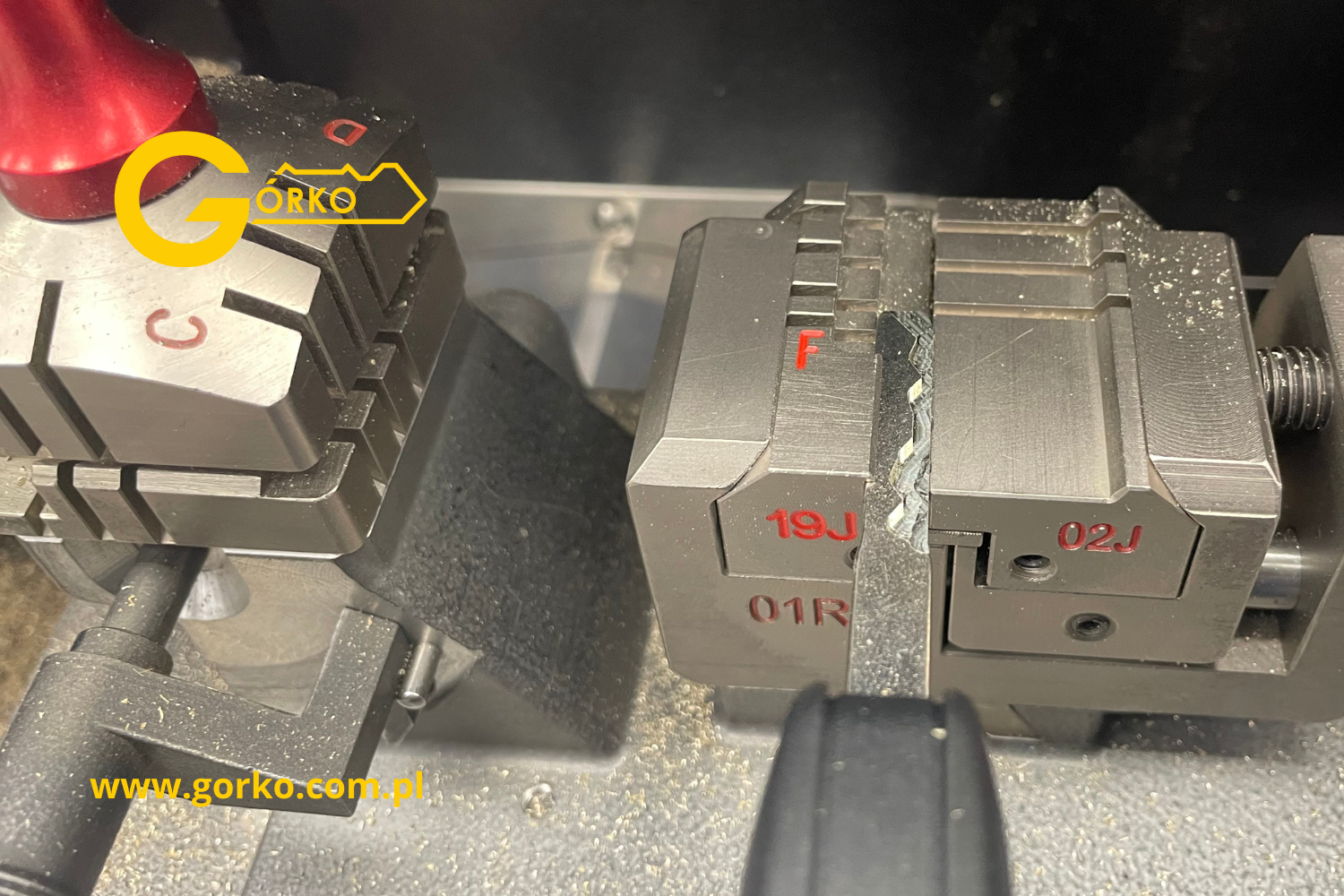 - docięcie nowych grotów kluczy na maszynie komputerowej CNC na podstawie numeracji zapadek,